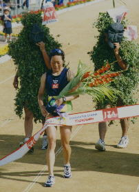 | 「感動への挑戦 ロマン街道 宮古島」をテーマに第十五回全日本トライアスロン宮古島大会は99!4月25日、池間、宮古島全域を舞台に行われ、スイム、バイク、マラソンの三種目で競われた。その中、ハンガリーから参加したピーター・クロプコが7時間30分05秒の大会新記録で初優勝、女子は山倉紀子(東京)が8時間49分28秒で5年ぶり3度目の優勝を果たした。最終参加者1、444人のうち、1.364人が完走した。 完走率は94.45%。大会には18の国と地域から参加した。 この日、気温21.4度、風速2メートル。熱い日差しの照りつける中、スイムスタートの午前7時半からラン終了の午後9時半まで、住民と選手が一体となった感動のあついドラマがかく集落、宮古路で繰り広げられた。 初出場で優勝したピーター・クロプコは7回大会で優勝したベストタイムを 1分55秒更新する7時間30分5秒で15回宮古島大会を制した。女子は雪辱に 燃え、5年ぶりの優勝を狙った山倉が8時間49分28秒でゴール。二位に10分 以上の大差で昨年4位の屈辱をはらした。 今大会は15回記念大会として海外18国、66人の外国勢選手の参加をはじめ過 去最多の1.444人(男子1.266人・女子178人)が出場し、上位を目指す 選手らは激しく競り合った。しかし出場し完走を目指す選手らはレースを楽しみ ボランティアとの交流をエンジョイしていた。 今大会では約5000人がボランティアとして参加。宮古島大会を支えた。 |