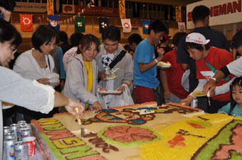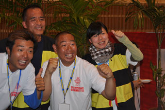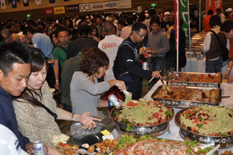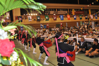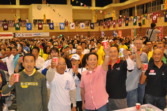 4月16日、大会二日前に市総合体育館で開催されたワイドーパーティ。参加した選手らは本番に備えてお互いの健闘を誓い合うとともにパーティを楽しんだ。(クリックで多少画像が大きくなります)