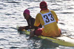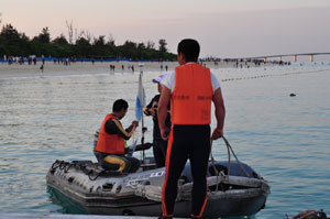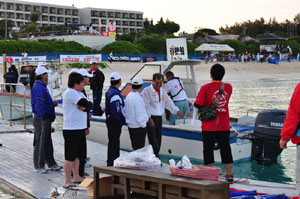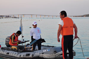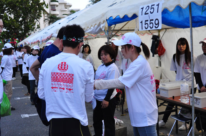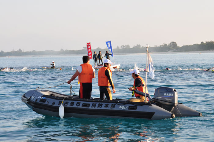大会を支えるのが、官民合同のボランティアスタッフです。午前7時のスタートを前に、まだ明けやらぬ時間から大会の安全を守るため、必死に選手を見守っている。水泳会場、バイクのコース、ランのコースなどで大会が終わるまで支える。