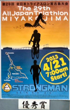 宮古島の美しい空と海の中でトライアスリート達の挑戦をシルエットで表現しました。特に沖縄特産のアカバナがひきたつようにバックは白と青で統一した。