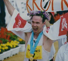 | 「感動への挑戦 ロマン街道 宮古島」をテーマに第十五回全日本トライアスロン宮古島大会は99!4月25日、池間、宮古島全域を舞台に行われ、スイム、バイク、マラソンの三種目で競われた。その中、ハンガリーから参加したピーター・クロプコが7時間30分05秒の大会新記録で初優勝、女子は山倉紀子(東京)が8時間49分28秒で5年ぶり3度目の優勝を果たした。最終参加者1、444人のうち、1.364人が完走した。 完走率は94.45%。大会には18の国と地域から参加した。 この日、気温21.4度、風速2メートル。熱い日差しの照りつける中、スイムスタートの午前7時半からラン終了の午後9時半まで、住民と選手が一体となった感動のあついドラマがかく集落、宮古路で繰り広げられた。 初出場で優勝したピーター・クロプコは7回大会で優勝したベストタイムを 1分55秒更新する7時間30分5秒で15回宮古島大会を制した。女子は雪辱に 燃え、5年ぶりの優勝を狙った山倉が8時間49分28秒でゴール。二位に10分 以上の大差で昨年4位の屈辱をはらした。 今大会は15回記念大会として海外18国、66人の外国勢選手の参加をはじめ過 去最多の1.444人(男子1.266人・女子178人)が出場し、上位を目指す 選手らは激しく競り合った。しかし出場し完走を目指す選手らはレースを楽しみ ボランティアとの交流をエンジョイしていた。 今大会では約5000人がボランティアとして参加。宮古島大会を支えた。 |