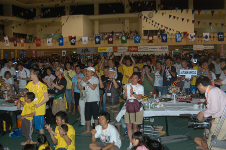 大会に備えて余興、地元の食材を堪能した選手ら
