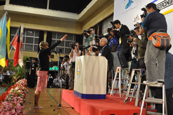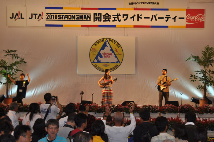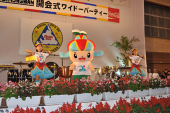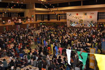 4月16日、大会二日前に市総合体育館で開催されたワイドーパーティ。参加した選手らは本番に備えてお互いの健闘を誓い合うとともにパーティを楽しんだ。(クリックで多少画像が大きくなります)