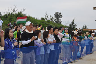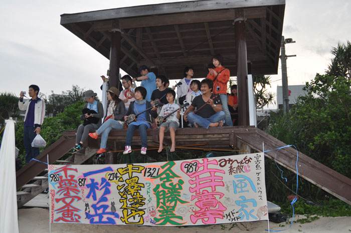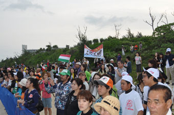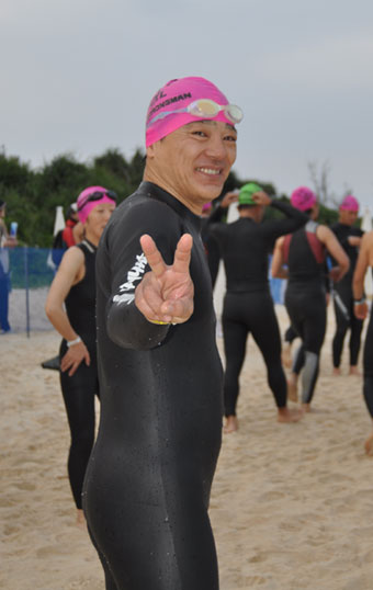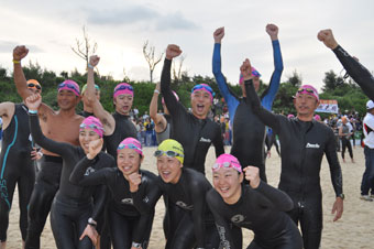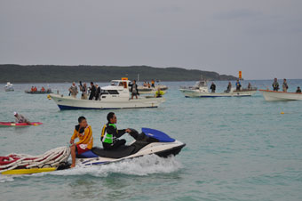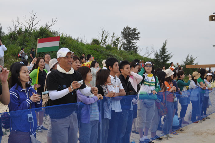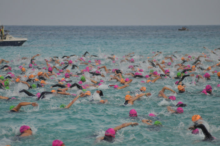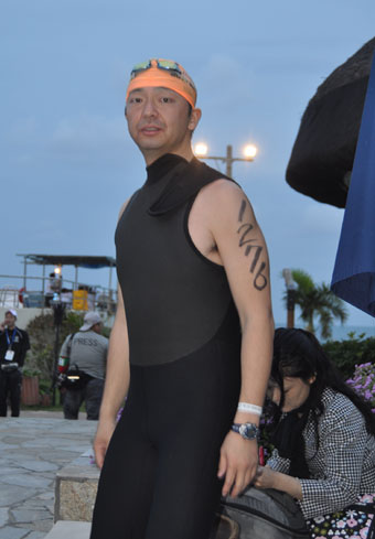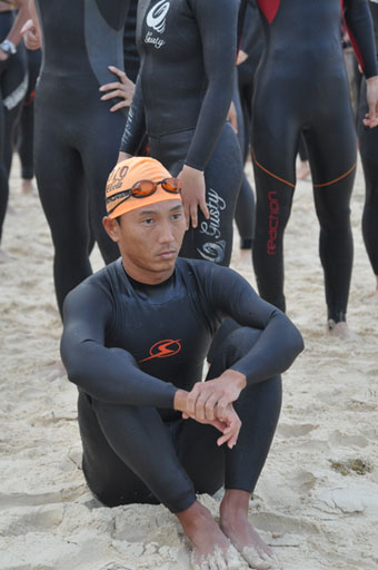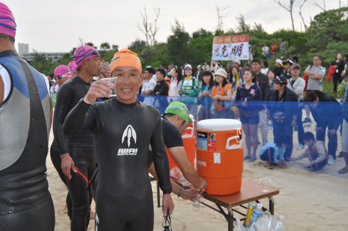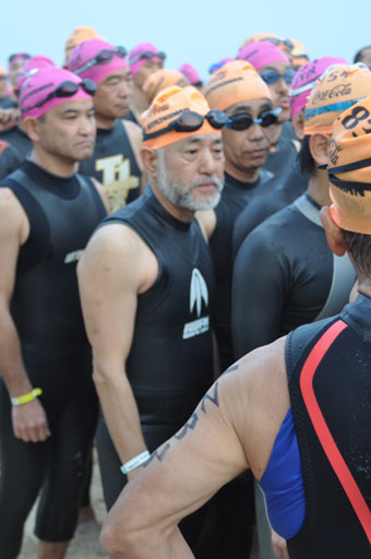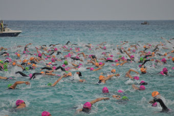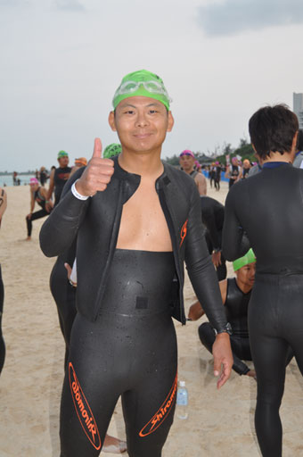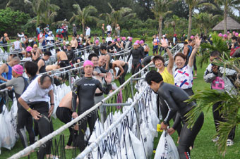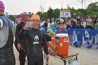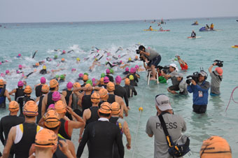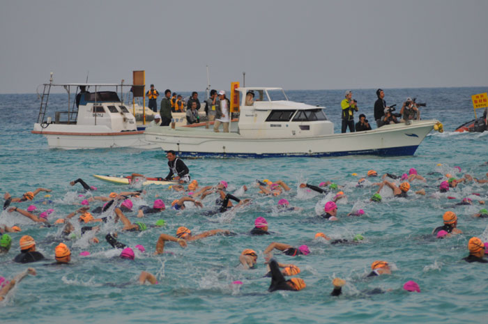 下地の前ビーチを出発、3キロを泳ぎきるスイム。この日の天候はうす曇り。気温21・5度、湿度73パーセント。出場した1394人が完泳した。(クリックで多少画像が大きくなります)