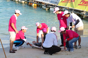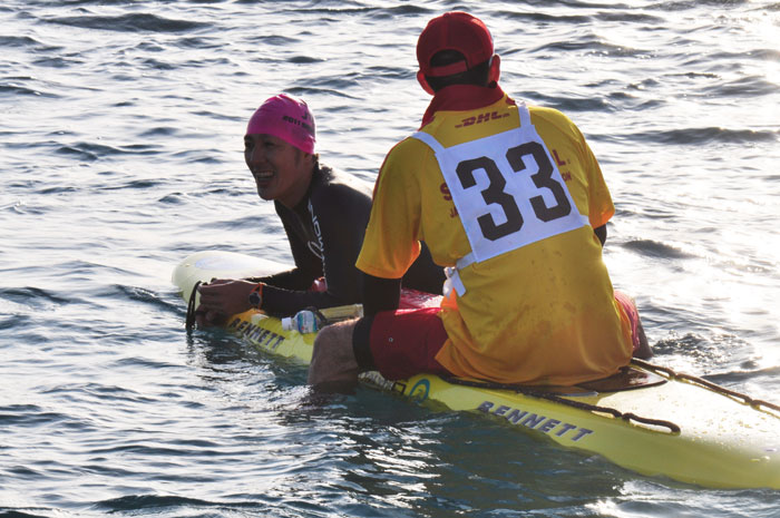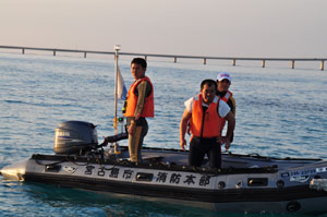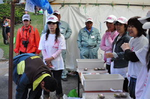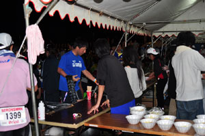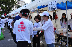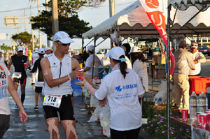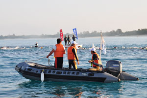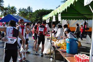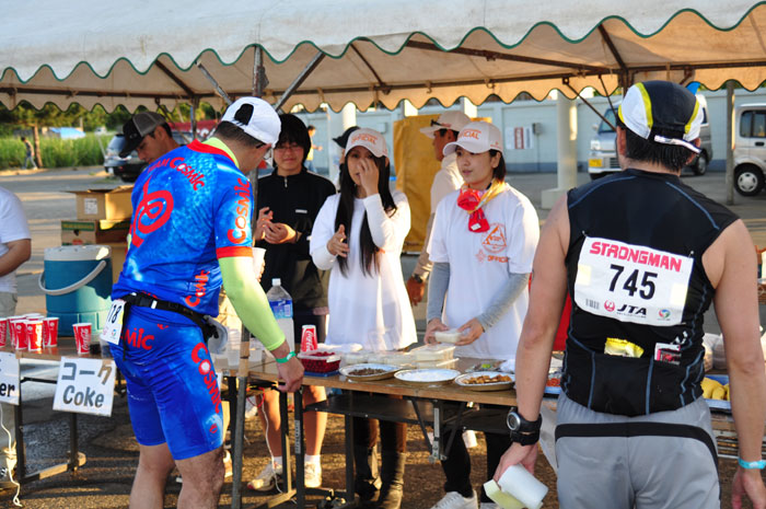 大会を支えるのが、官民合同のボランティアスタッフです。午前7時のスタートを前に、まだ明けやらぬ時間から大会の安全を守るため、必死に選手を見守っている。水泳会場、バイクのコース、ランのコースなどで大会が終わるまで支える。