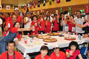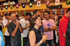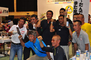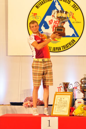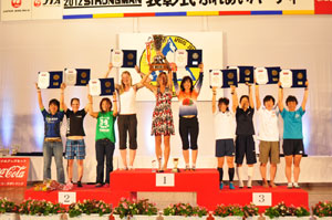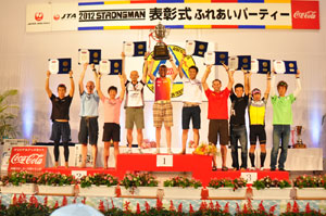 市総合体育館で開催された閉会式。総合で栄冠をつかんだアントン・ブロックヒン選手(ウクライナ)と女子優勝のビーテ・ゴエーツ選手(ドイツ)に優勝楯や大会長杯などが贈られた。また完走者1231人をたたえた。また選手らは地元の料理などを楽しんだほか、乾杯や記念写真などで式を楽しみながら、来年の大会に思いをはせていた。