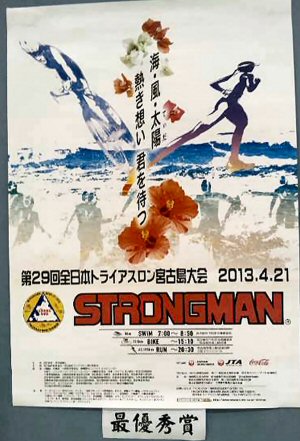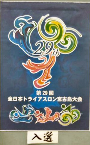 宮古島の美しい空と海の中でトライアスリート達の挑戦をシルエットで表現しました。特に沖縄特産のアカバナがひきたつようにバックは白と青で統一した。